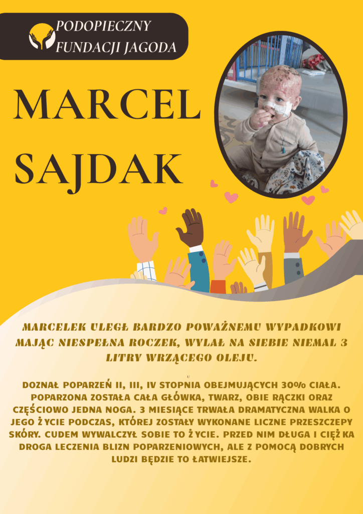 Całkowity dochód z kiermaszu zostanie przeznaczony na wsparcie Marcelka Sajdaka, podopiecznego Fundacji Jagoda. Marcelek, mając niespełna roczek, uległ bardzo poważnemu wypadkowi i doznał rozległych oparzeń.💛