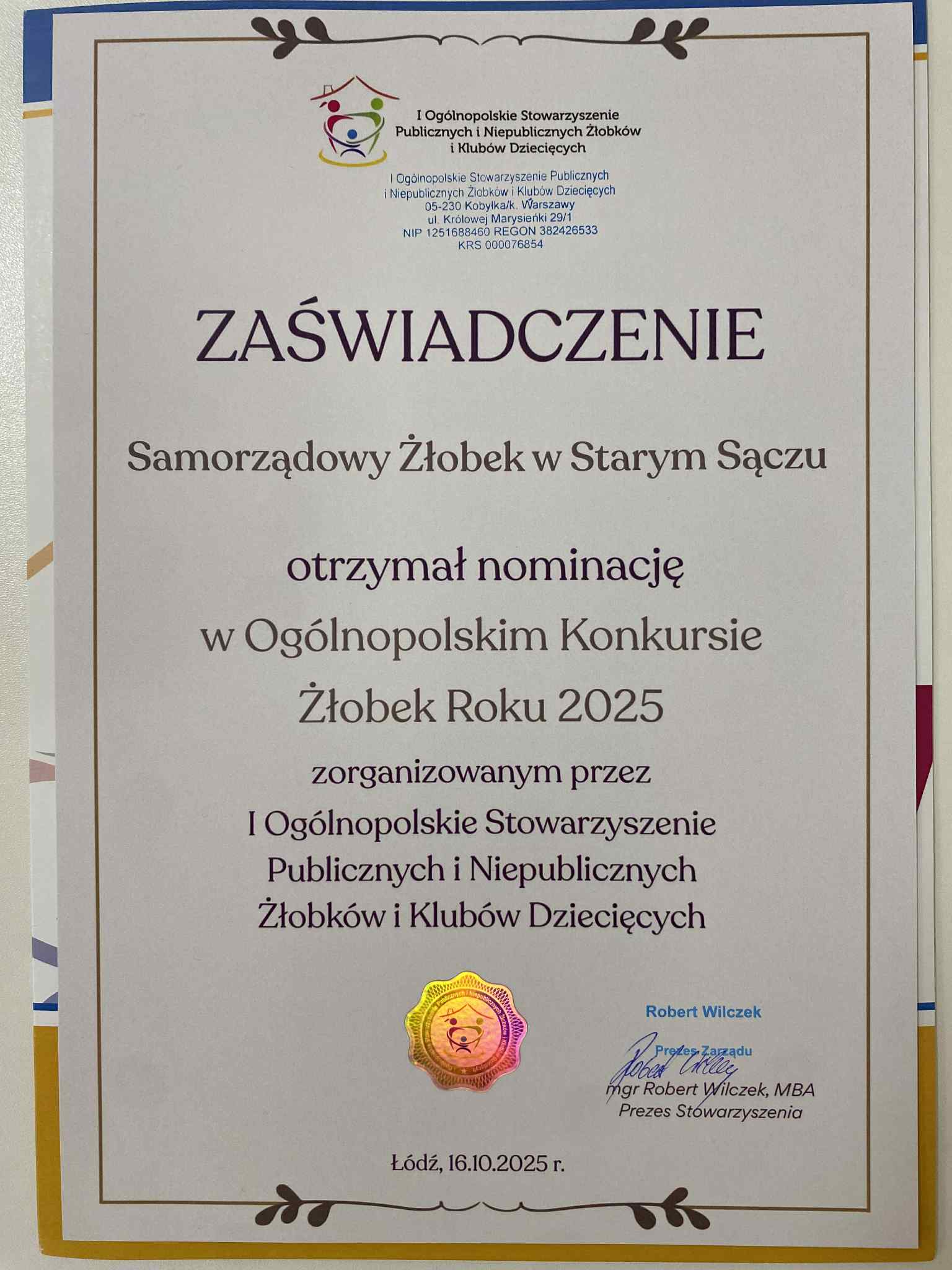 Mimo że dopiero zaczynamy swoją przygodę, postanowiliśmy spróbować swoich sił w ogólnopolskim konkursie „Żłobek Roku 2025”. Dla nas było to ogromne wyzwanie, ale przede wszystkim bardzo ciekawe i wartościowe doświadczenie 🌟Z ogromną radością informujemy, że otrzymaliśmy nominację oraz pamiątkowy dyplom, który jest dla nas dowodem na to, że to, co robimy, ma sens i jest zauważane 🤍Dziękujemy wszystkim, którzy są częścią naszej codzienności – dzieciom, rodzicom i całemu zespołowi – za zaufanie, wsparcie i cudowną współpracę 🤝💛