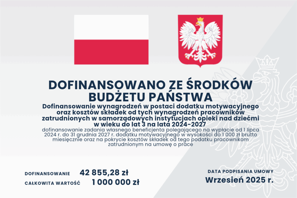 Placówka otrzymała dofinansowanie ze środków budżetu państwa w ramach programu wspierającego samorządowe instytucje opieki nad dziećmi w wieku do lat 3 na lata 2024–2027.